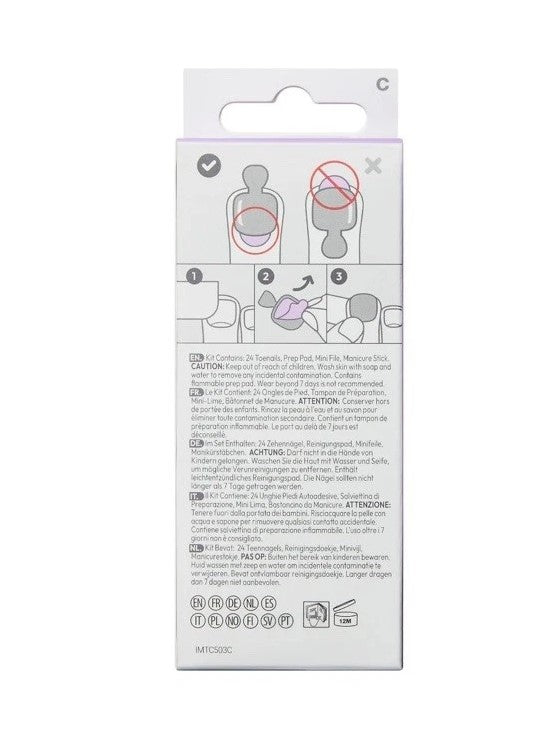 - Pedicure kit contains 24 press on toenails, prep pad, mini nail file, and pedicure stick