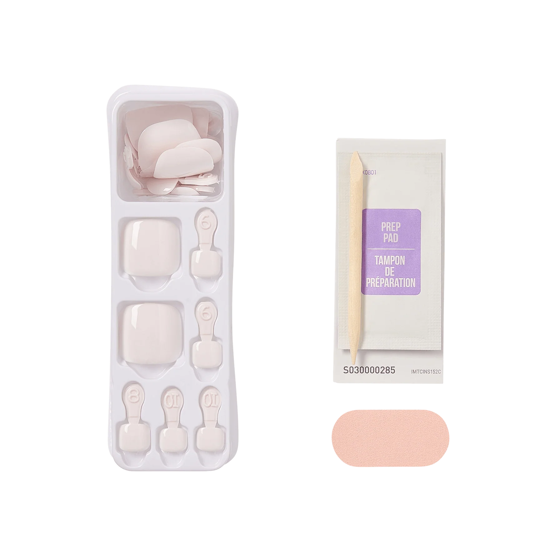 - Pedicure kit contains 24 press on toenails, prep pad, mini nail file, and pedicure stick