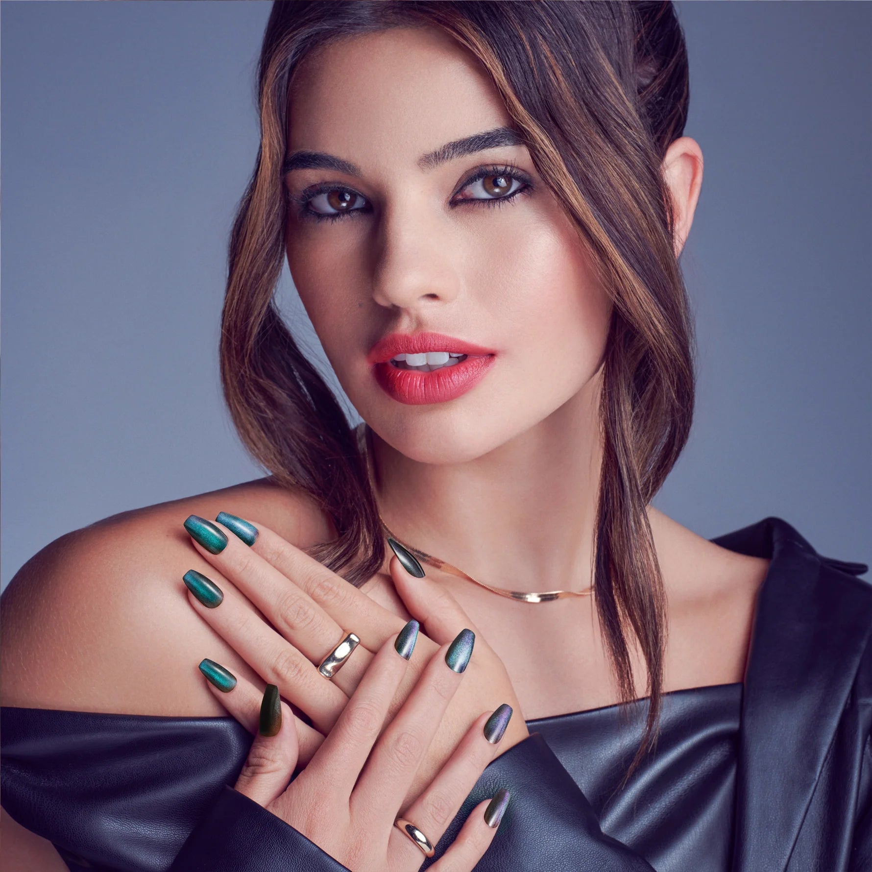 These super dimensional nails are made with a magnetic powder effect that imparts a textured and velvety finish, just like the popular salon magnetic nails.