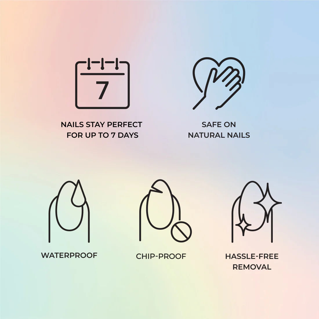 - Nail kit contains 28 Fake Nails, Pink Gel Nail Glue (2g), Mini Nail File, & Manicure Stick