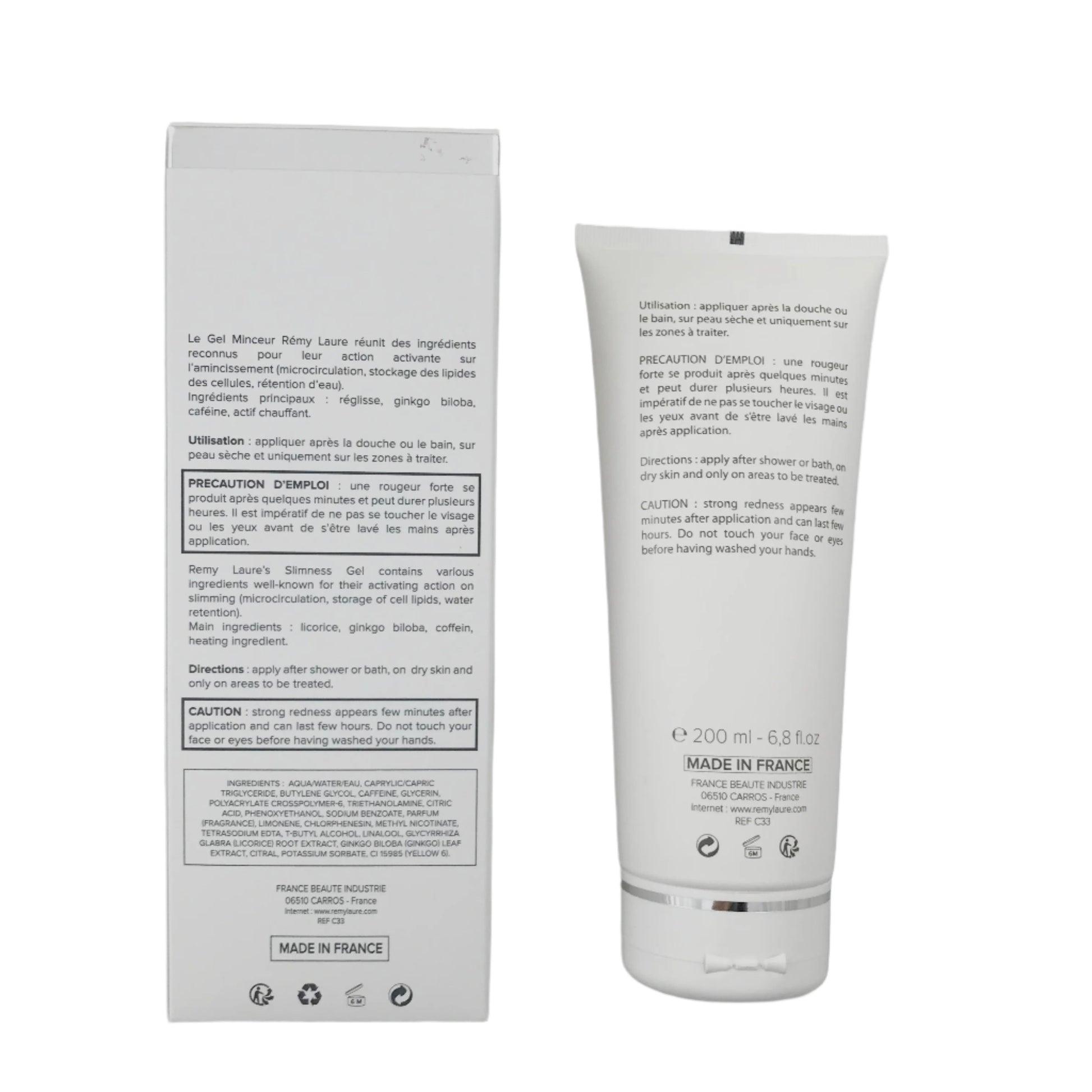 Remy Laure’s Slimness Gel contains various ingredients well-known for their activating action on slimming (microcirculation, storage of cell lipids, water retention).
